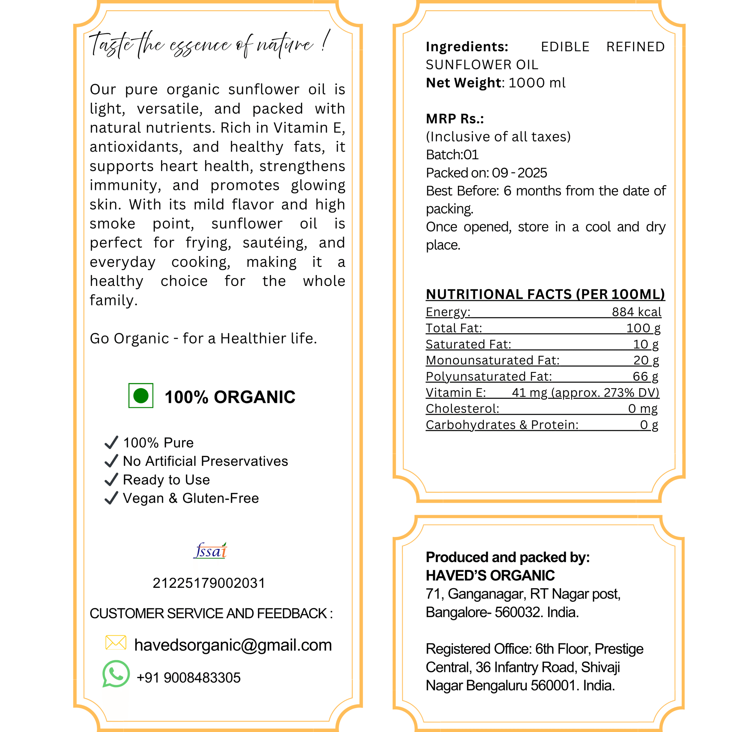 Enjoy light, healthy, and flavorful cooking with our Refined Sunflower Oil — a perfect choice for everyday use. Extracted from premium-quality sunflower seeds and refined to perfection, this oil is rich in Vitamin E and Omega-6 fatty acids, helping you maintain a healthy heart and glowing skin.