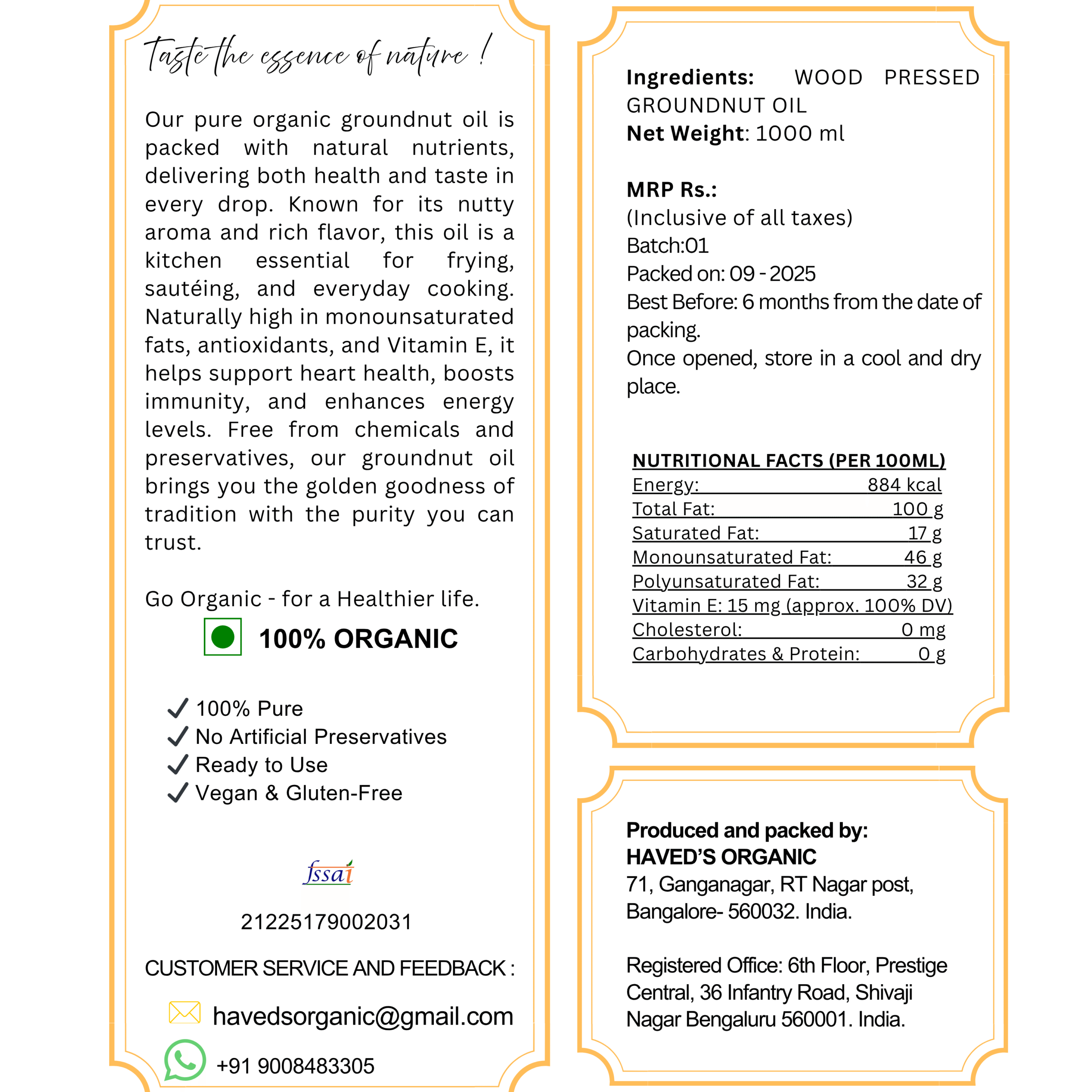 Our Wood-Pressed Groundnut Oil is made from premium-quality peanuts, slowly extracted using traditional wooden churners (chekku or ghani), without heat, chemicals, or refining. This age-old method preserves the oil’s natural nutrients, aroma, and flavor — giving you a wholesome, unadulterated cooking experience.